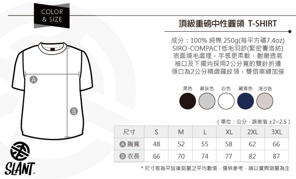 ※尺寸表與實際衣服上下誤差約2cm(縮率值為5-8%內),100%純棉T下皆會有正常的縮率,可量測平常所穿著T-SHIRT尺寸來決定所要選購的SIZE喔,購買前請詳閱尺寸說明圖!